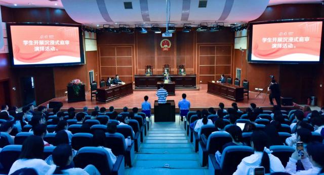 随后进行了模拟庭审环节。模拟法庭以真实的大学生国家安全犯罪案例为原型,高度还原了真实庭审的场景。全场人员在国徽下庄严宣誓,“模拟法官”们各司其职、有条不紊地推进“庭审”程序,旁听席上的师生们全程参与“庭审”流程,切身感受到法律的威严与神圣。“庭审”结束后,吴法官“以案说法”现场进行点评,对同学们开展国家安全法治宣传教育。在互动环节中,学生踊跃举手提问,积极分享感受,现场气氛活跃。