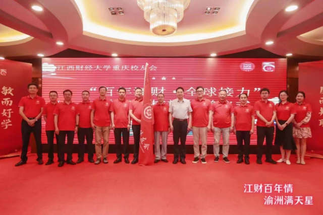 随后举行了“百年江财·全球接力”重庆站校旗传递仪式。重庆校友会蒙高原会长从四川校友会古时银会长手中接过了江西财经大学校友会旗帜。