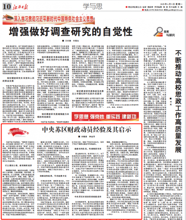 6月5日,《江西日报》“学与思”版块刊登马克思主义学院院长刘晓泉和博士生钟金芳理论文章《中央苏区财政动员经验及其启示》。