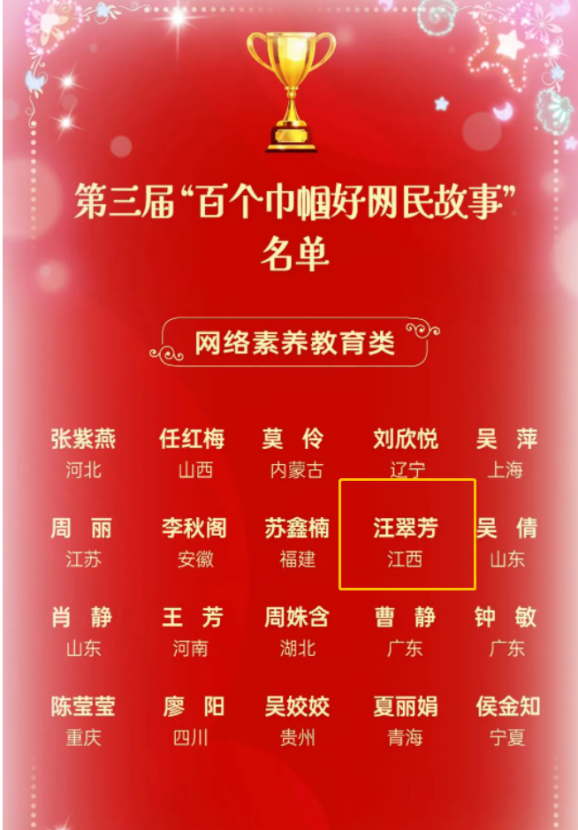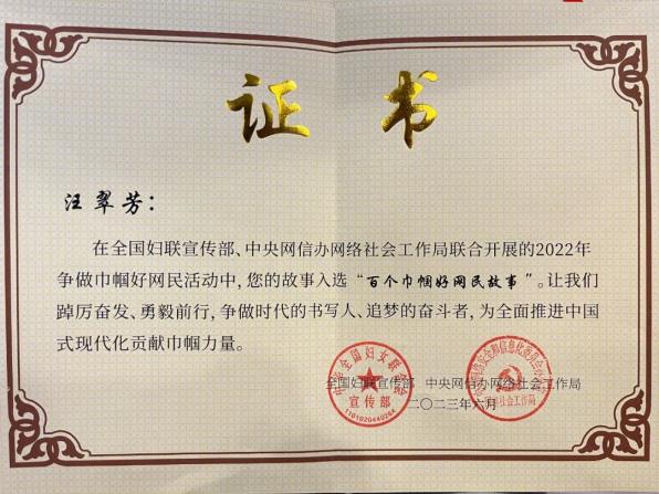 6月6日,2023年度“争做巾帼好网民”主题活动启动仪式在北京举行,活动现场发布了2022年第三届“百个巾帼好网民故事”暨“十大争做巾帼好网民优秀案例”推选结果,虚拟现实(VR)现代产业学院副院长汪翠芳的案例入选全国“百个巾帼好网民故事”。