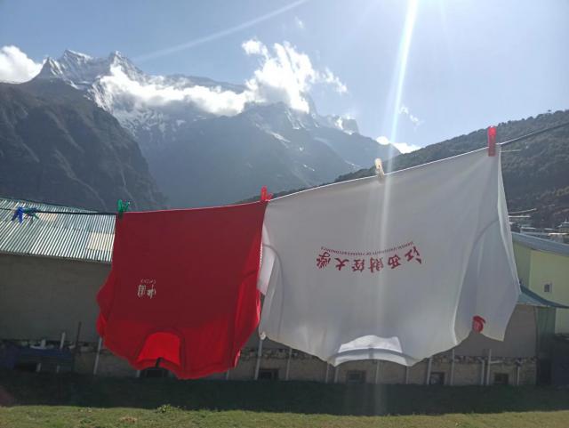 这次比赛从前期准备到最后冲刺可谓是困难重重。前期受疫情影响,能否获得参赛资格、或是拿到签证都充满着不确定性;对于参赛选手来说,最具挑战的事情是能够适应高海拔。从广州出发,经成都转加德满都,随后小飞机前往卢卡拉,最后步行抵达珠峰大本营。一路上,为了控制携带的重量,他扔掉了冰抓和备用的衣物,甚至还扔掉了一包本就不多的压缩饼干,但那面江财校旗,却始终被放在背包的最里面。