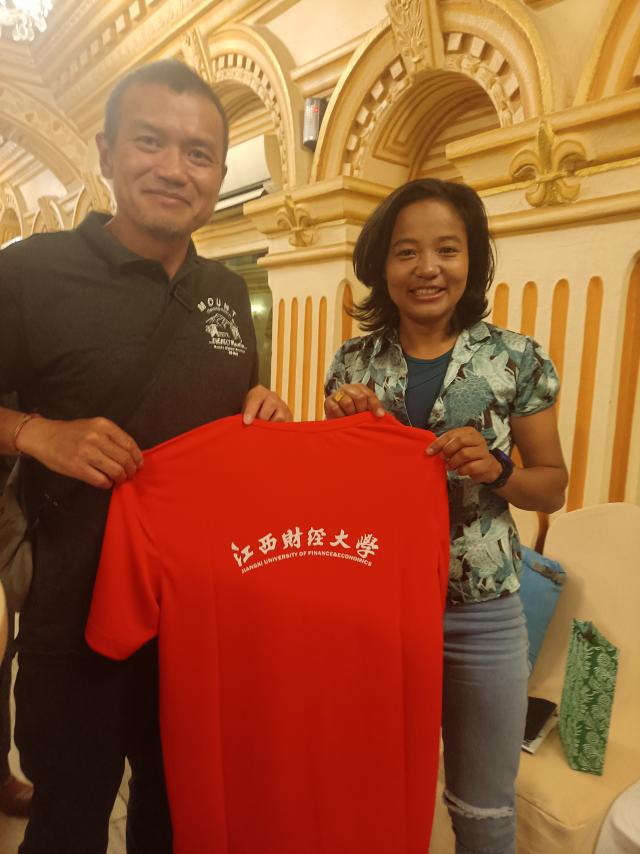 (邓超将江财队服赠给尼泊尔传奇越野运动员米拉)