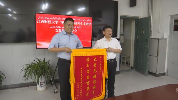 为支持叶城县第四中学办学,卢福财代表学校向叶城县第四中学捐助10万元。龙世新向江西财经大学送锦旗并向一行领导赠送新疆特色花帽。