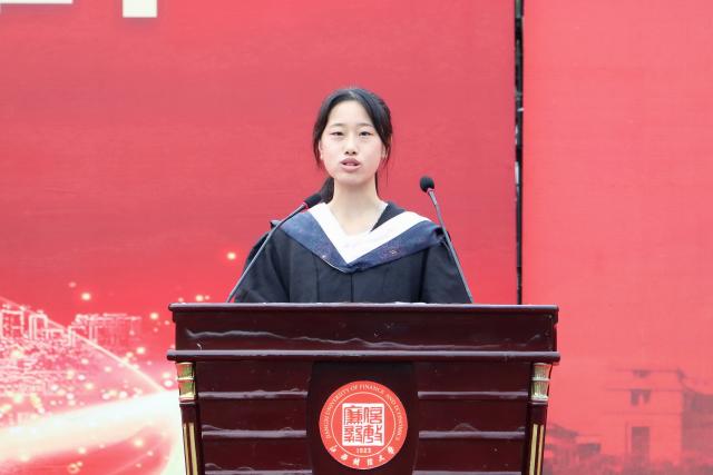 江财陪伴我们成长,我们也有幸见证了江财的荣光。江财师生多次在国内外顶级期刊发表论文成果,彰显江财学术力量;虚拟现实产业学院、赣州研究院、数字经济学院相继揭牌,江财始终紧跟时代,与时俱进;校友邓超登上珠峰,让江财的旗帜在世界之巅迎风飘扬……。在校期间,我们还与江财携手,共同迎来中国共产党成立一百周年,见证脱贫攻坚、全面建成小康社会历史任务的完成,跟随党的二十大开启中国式现代化的新长征……。这些特殊的经历,也注定我们需要肩负起特殊的使命。习近平总书记强调,我们比历史上任何时期都更接近中华民族伟大复兴的目标,需要做好“经受风高浪急甚至惊涛骇浪的重大考验”的准备。作为新时代青年,我相信我们定高扬“信仰之帆”、唱响“奋斗之歌”、掌好“前行之舵”,以奋斗之青春,赴时代之山海。