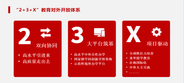 “3”大平台筑基:聚力打造高水平中外合作办学、国家级学科引智基地、示范性境外办学平台三大载体,夯实国际合作基础。