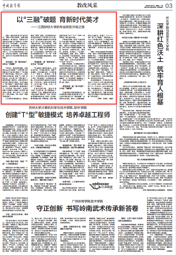 近日,《中国教育报》刊登“以‘三融’破题育新时代英才——江西财经大学的专业转型升级之路”,全面报道学校以“三融”破题,走出了自主专业转型升级之路,交出了数智时代专业转型升级的“江财答卷”。