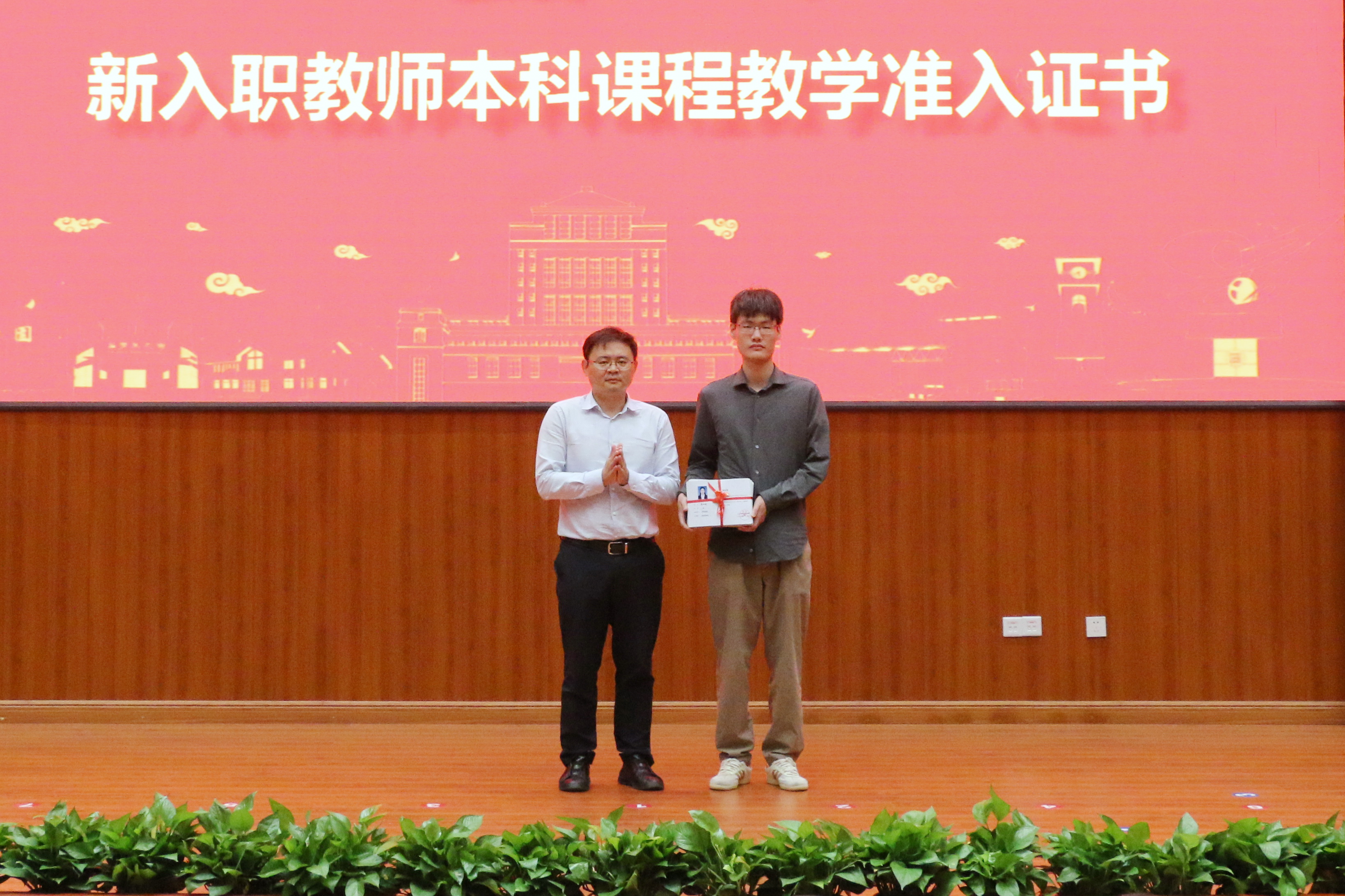 副校长方玉明为新入职教师代表颁发《江西财经大学新入职教师本科课程教学准入证书》。