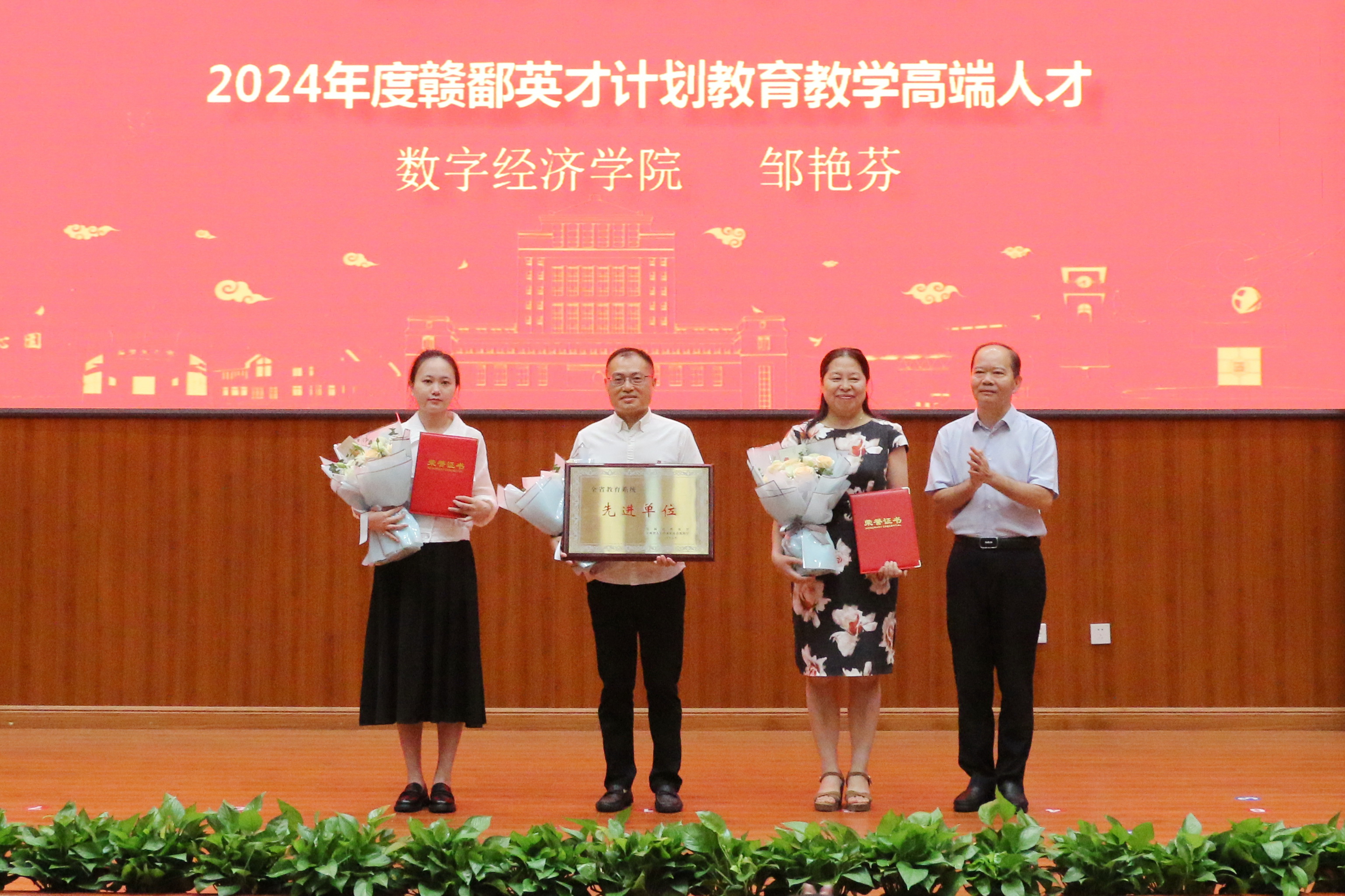 副校长李春根为获得2025年全省教育系统先进单位统计与数据科学学院领奖代表陶春海书记,2025年全省模范教师、国际经济与政治学院李秀香教授,2024年度赣鄱英才计划教育教学高端人才、数字经济学院邹艳芬教授颁奖并献花。