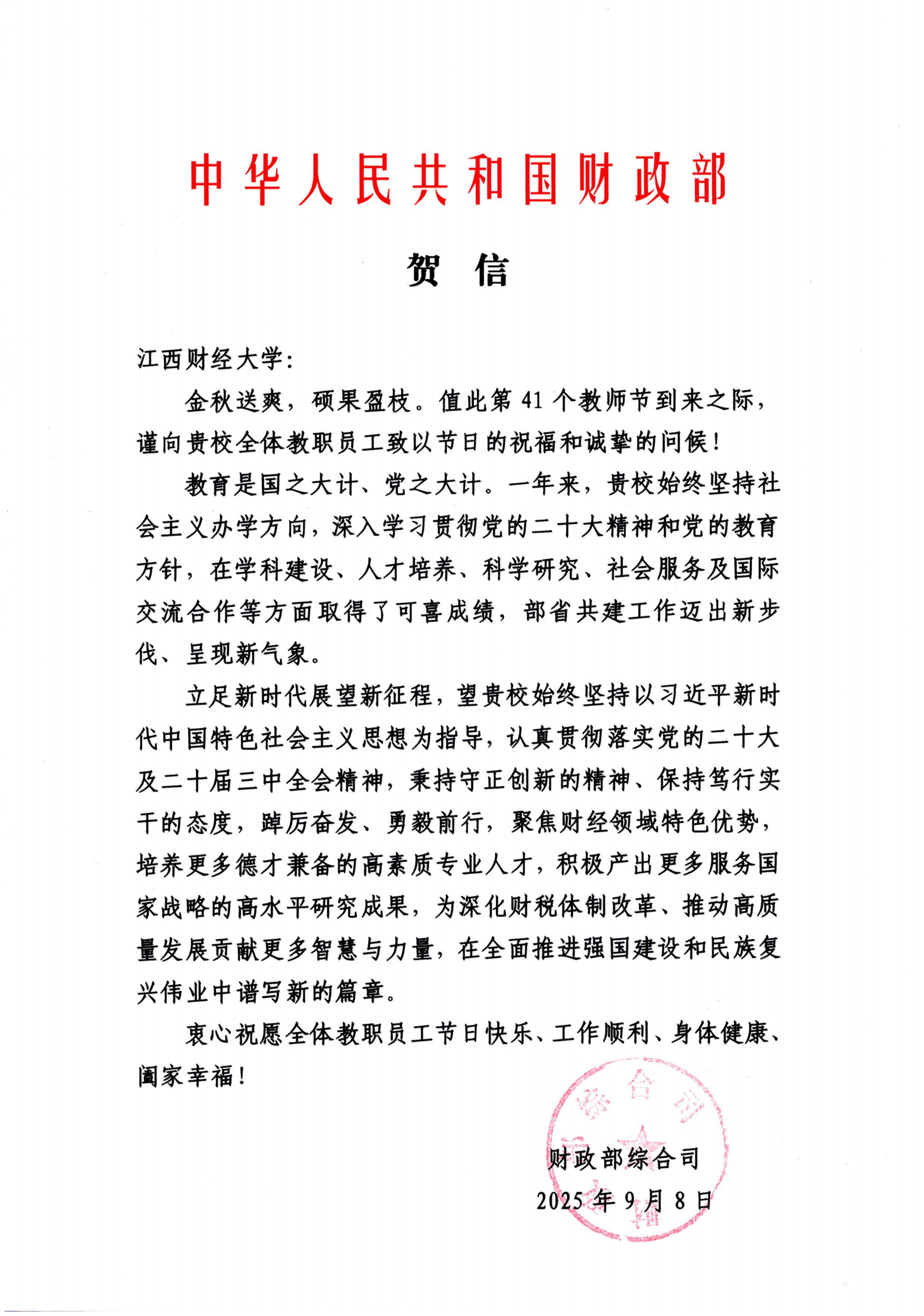 立足新时代展望新征程,财政部希望学校始终坚持以习近平新时代中国特色社会主义思想为指导,认真贯彻落实党的二十大及二十届三中全会精神,秉持守正创新的精神、保持笃行实干的态度,踔厉奋发、勇毅前行,聚焦财经领域特色优势培养更多德才兼备的高素质专业人才,积极产出更多服务国家战略的高水平研究成果,为深化财税体制改革、推动高质量发展贡献更多智慧与力量,在全面推进强国建设和民族复兴伟业中谱写新的篇章。衷心祝愿全体教职员工节日快乐、工作顺利、身体健康、阖家幸福!