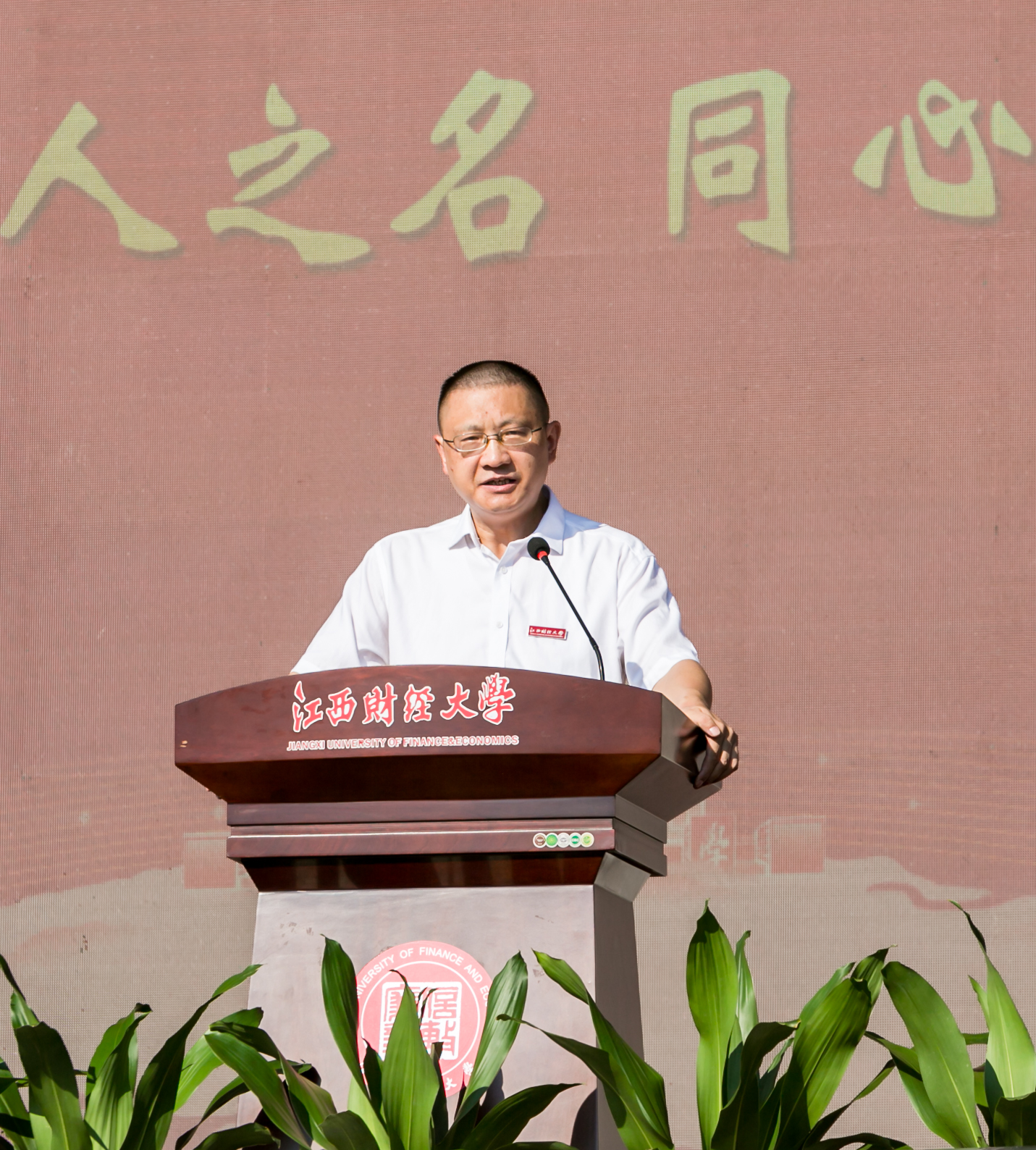 亲爱的同学们、家长们!站在这里,我想首先和大家聊聊我们的“缘分密码”。咱们绝大多数同学到校的时间是9月12日、13日或者14日,虽然各自报到时间不一,但日期数字连接起来,恰好是“9121314”。这是中国人最浪漫的告白:“就要爱一生一世”。这就是爱!是你们跨越山海、奔赴而来,江财翘首以盼、欢喜相迎的约定;也是我们成为江财一家人的起点,是我们双向奔赴最温暖的注脚。我想,你们都有取名为“相亲相爱一家人”或者“幸福快乐一家人”的家庭微信群,而从今天起,你们走进了江财的校园,江财同样也进入了你们的人生,我们就拥有了一个共同的名字——“江财人”。我们就是“相亲相爱的江财一家人”。