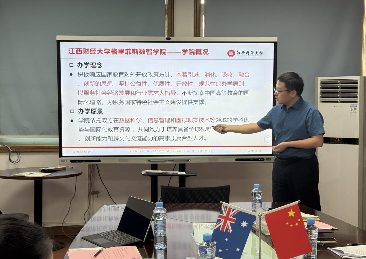 9月23日,澳大利亚格里菲斯大学代表团来校访问并召开江西财经大学格里菲斯数智学院管理委员会第一次会议。副校长袁红林会见了代表团一行。格里菲斯大学副校长Marnie Watson、理学部学术院长Rosalind Archer、信息与通信技术学院院长Alan Liew、国际部大中华区市场总监Jennifer以及我校计算机与人工智能学院、数智学院相关负责人参加会议,会议由袁红林主持。