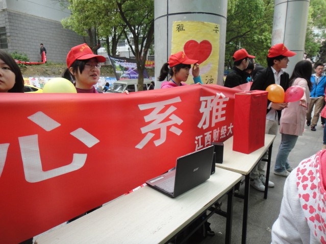 4月21日至22日,江西财经大学校青协组织了为四川雅安地震募捐的爱心活动。募捐活动的主题是“心系雅安,与爱同行”。对于四川雅安的突发性大地震,江财学子们都深表同情。灾害虽然无法避免,但是“一方有难,八方支援”的原则是不会变的。志愿者们在人来人往的食堂门口组织同学们进行募捐,大声的向过往的同学呼吁,希望大家都献出自己的一份爱心――为使地震灾区的人们早日重建家园,过上和谐幸福美满的生活而尽一份力。有很多同学都自发的走向红色捐款箱,将自己对雅安人民的一点心意与祝福都投入了这个承载着爱与期盼的红色捐款箱中。