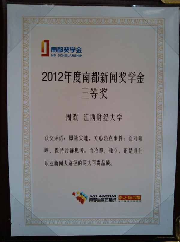 在去年获得第七届南都新闻奖学金后,我校人文学院2011级传播学硕士生周欢凭借在经济新闻采写和评论创作方面的表现荣获本届南都新闻奖学金三等奖。“脚踏实地,关心热点事件;面对喧哗,保持冷静思考。而冷静、独立,正是通往职业新闻人路径的两大可贵品质。”由业界和学界组成的评委会在他的获奖评语中如是说。