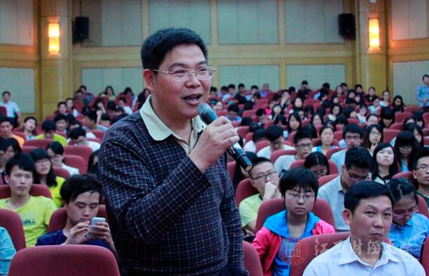 郑新立教授为在场师生带来题为《把握新常态下的新亮点新机遇》的精彩演讲。他以今年的《政府工作报告》为切入点,用简洁的语言归纳出中国经济新常态下在收入分配、产业分配、技术创新方面呈现的“三大亮点”,结合当前中国经济运行过程中面临的需求不足、经济下行、通货紧缩等主要矛盾,提出“认清和做大新亮点”、“用好宏观经济政策和融资改革新机遇”、“用好农业现代化和新型城镇化新机遇”、“用好行政体制改革和国有企业改革新机遇”等目标。他由中国各地区经济发展的实例和江西经济发展的情况出发,从辩证、动态的角度详细分析说明了实现这些目标的具体要求和方法,高瞻远瞩的观点令现场听众深受启发、获益匪浅。在随后的现场提问环节中,郑教授根据听众所提出的问题,就“环境问题”、“收入增长与GDP增长的矛盾”、“市场决定资源配置与政府发挥职能的矛盾”等方面做了进一步的补充分析,清晰的思路、缜密的逻辑、敏锐的视角赢得了在场师生经久不息的掌声。