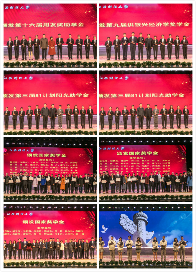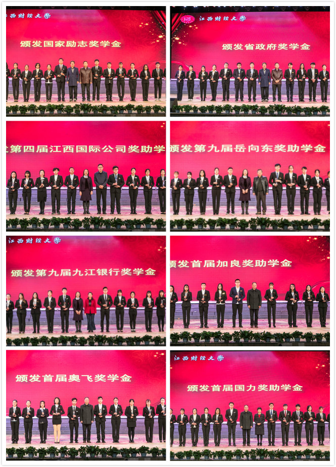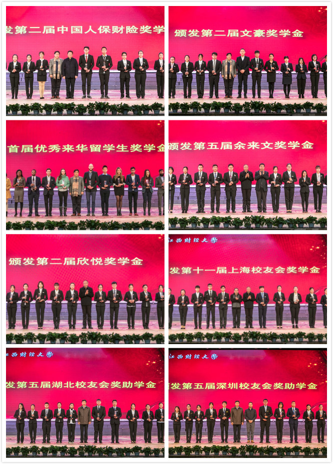 表彰徐阳奕等25名九江银行奖学金获奖学生,每名6000元。罗珊珊等10名江西国际公司奖学金获奖学生,每名8000元。闵嘉强等40名江西国际公司助学金获奖学生,每名3000元。王丽芝等20名中国人保财险奖学金获奖学生,每名5000元。张向阳等20名洪银兴经济学奖学金获奖学生,每名1000元。刘子婷等50名岳向东奖助学金获奖学生,每名2000元。林佳慧等50名用友奖助学金获奖学生,每名1000元。丁佳妮等30名上海校友会奖学金获奖学生,每名3000元。吕艳妮等10名湖北校友会奖学金获奖学生,每名2000元。厉琴等20名湖北校友会助学金获奖学生,每名1000元。风铃等10名余来文奖学金获奖学生,每名5000元。林雪容等10名欣悦奖学金获奖学生,每名3000元。吴佳意等10名文豪奖学金获奖学生,每名5000元。邓涵宇等25名81计划阳光爱心奖助学金获奖学生,每名8000元。吴翟等20名奥飞奖学金获奖学生,每名5000元。江洋等4名国力奖学金获奖硕士研究生,每名5000元,罗婷等16名国力奖学金获奖本科学生,每名3000元,江海霞等16名国力助学金获奖学生,每名2000元。余海华等10名深圳校友会奖学金获奖学生,每名2000元。孙健炜等20名加良奖学金,每名3000元。