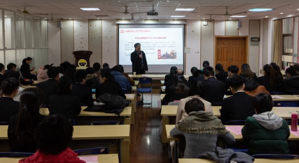 仪式结束后,学工部党支部全体党员现场缴纳12月份党费,通过缴纳仪式感重温入党初心。随后,蒋金法书记为先锋班党员及学工部党支部全体党员上了题为“不忘初心,继续前行”的党课,与在座党员一起重温了入党时的初心。书记从《共产党宣言》、“红船精神”、井冈山精神回望了历史上共产党人的初心,指出在建党初期共产党人的初心是为贫苦大众谋幸福;从我党团结带领中国人民建立中华人民共和国,到建立社会主义基本制度,再到进行改革开放,带领中国人民富起来,指出我们要坚守近现代共产党人的真心;最后,介绍了我国取得的十大历史性成就,并从政治、经济、文化、社会、生态、国防和军队、“一国两制”、外交、党建方面展望新时代共产党人的用心。激励同学们从身边的小事做起,不忘初心,成为真正有共产主义信仰的合格共产党员,并呼吁大家为江西财经大学的美好未来共同努力。(文/孔庆宁 图/王文泉)