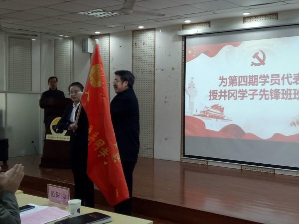 党委副书记蒋金法为第四期井冈学子先锋班班长授班旗。